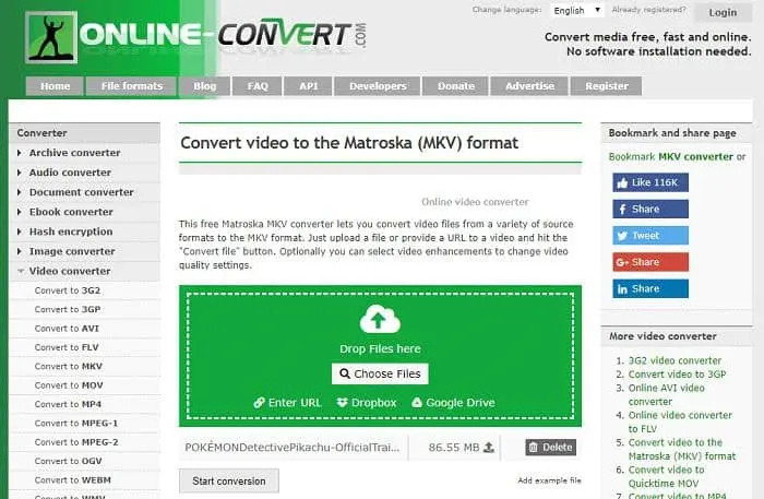 Online Convert是一個方便的轉檔工具,你可以免費使用,不需要下載任何東西。它在自定義選項和額外功能方面不如傳統轉檔軟體豐富,但它的功能相當不錯,可以毫無問題地將AVI轉檔為MKV。以下是它的工作原理: