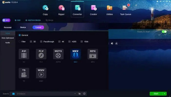 4. 一旦你全部完成,只需點擊靠近底部的檔案夾圖示,選擇你想保存輸出檔案的地方,然後點擊開始按鈕,將AVI轉檔為MKV格式。