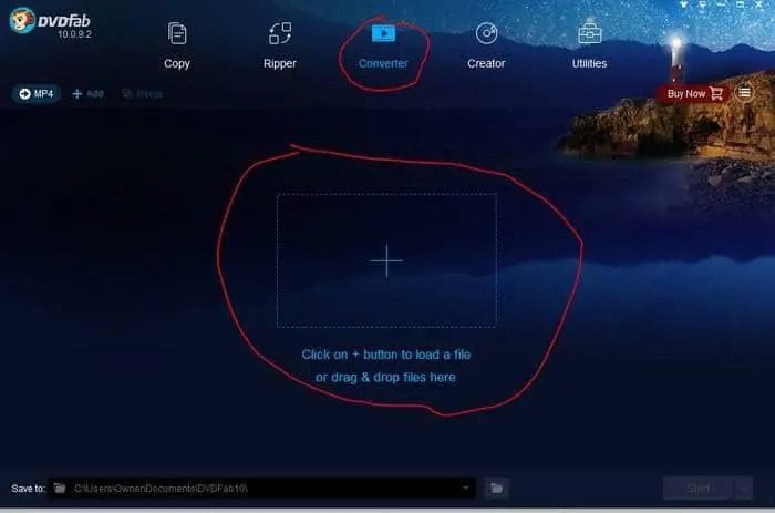 1) 安裝好DVDFab後,啟動它並點擊“轉檔”模組,下一步是加載你的檔案,點擊轉檔器介面中間的+號來完成。或者,你也可以把你的視頻檔案拖到同一位置。