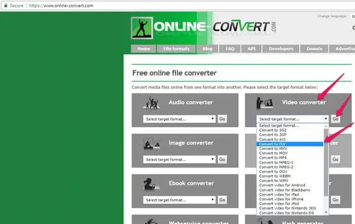 訪問網站,online-convert.com,並在那裏選擇,FLV從視頻轉檔器下顯示的下拉菜單。