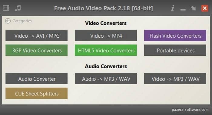 Pazera-software的免費音頻視頻包是一個視頻和音頻轉檔器的包或集合,支持所有主要視頻和音頻格式之間的轉檔。它是一個免費軟體,支持Windows XP / 2003 / Vista / 2008 / 7 / 8 / 10。支持的格式有:AVI, MP3, MP4, FLAC, MOV, WMV, WMA, FLV, 3GP, OGG, WebM等。這個軟體唯一令人失望的是,它不能檢測輸入檔案的類型。你必須自己從用戶介面的主螢幕上給出的支持選項列表中選擇輸入和輸出格式。