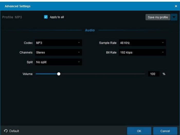 第4步 - 如果你想改變輸出的MP3檔案的屬性,這是一個可選的步驟。使用DVDFab Video Converter的高級設置選項,通過改變其音頻通道、比特率或採樣率來定制輸出檔案。