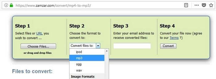 Zamzar MP4到MP4音頻轉檔器是一個線上工具,只需要你上傳你的MP4,選擇輸出格式為音頻格式,輸入你的電子郵件ID並點擊轉檔。你可以選擇多個MP4檔案或其他類型的視頻檔案,以批處理模式從它們中翻錄MP3。轉檔過程完成後,下載轉檔檔案的鏈接將通過電子郵件發送給你。給你的電子郵件ID可能會損害你的隱私,所以如果你想去這個選項的MP4音頻轉檔,請謹慎選擇。