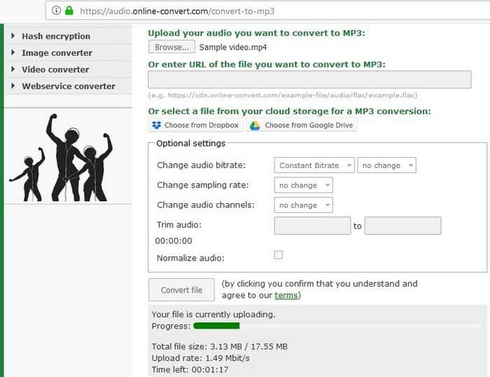 Online-convert網站提供了很多工具,如圖像轉檔器、視頻轉檔器、電子書轉檔器、哈希加密以及音頻轉檔器。它為你提供了先進的工具來改變採樣率、音頻比特率、修剪視頻或改變輸出的MP3音頻檔案的音頻通道。它不需要註冊,你可以直接從你的電腦上傳一個檔案進行轉檔,或者提供一個保存在網上某個地方的檔案的鏈接,如穀歌硬碟或Dropbox。唯一的限制是,它不支持批量MP4到音頻的轉檔。轉檔完成後,你會被重定向到另一個頁面,該檔案可供下載。