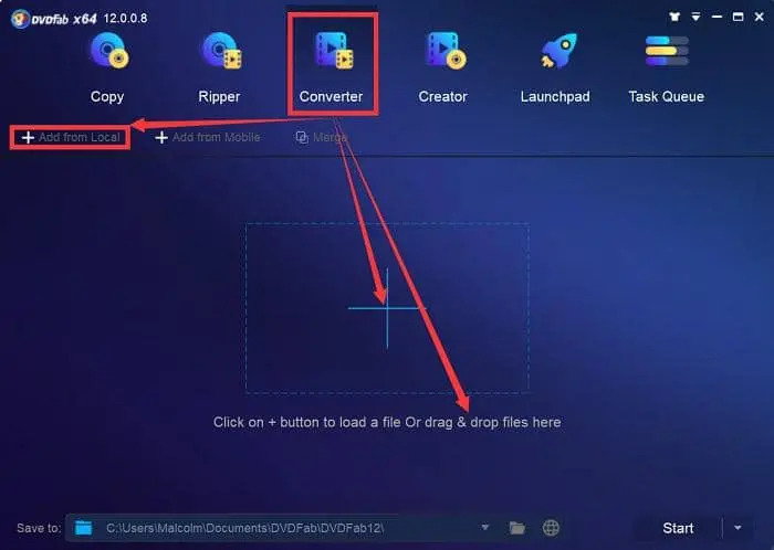 DVDFab視頻轉檔軟體是DVDFab 12的模組之一。所以在你啟動DVDFab 12後,記得點擊頂部的 "轉檔"模組。然後使用 "從本地添加 "或 "+"圖示加載你的MKV檔案。DVDFab Video Converter是解決如何將MKV檔案轉檔為MP4的最佳答案,所以在這裏你可以根據自己的需要輸入許多視頻。