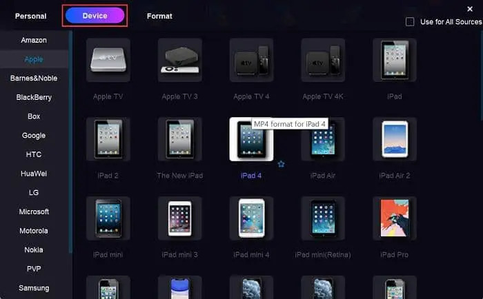 如何在一個特殊的設備上將MKV轉檔為MP4?點擊 "設備 "選項,根據你的需要選擇一個。這裏有 "Amazon, Apple, Box, Google "等,供您選擇。