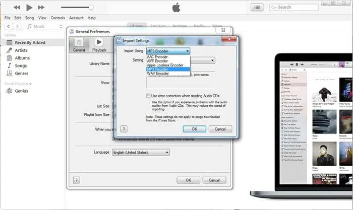 2. 在 "導入設置 "對話框中,打開 "導入使用 "對話框,選擇 "MP3編碼器"。點擊 "OK "按鈕,保存設置。