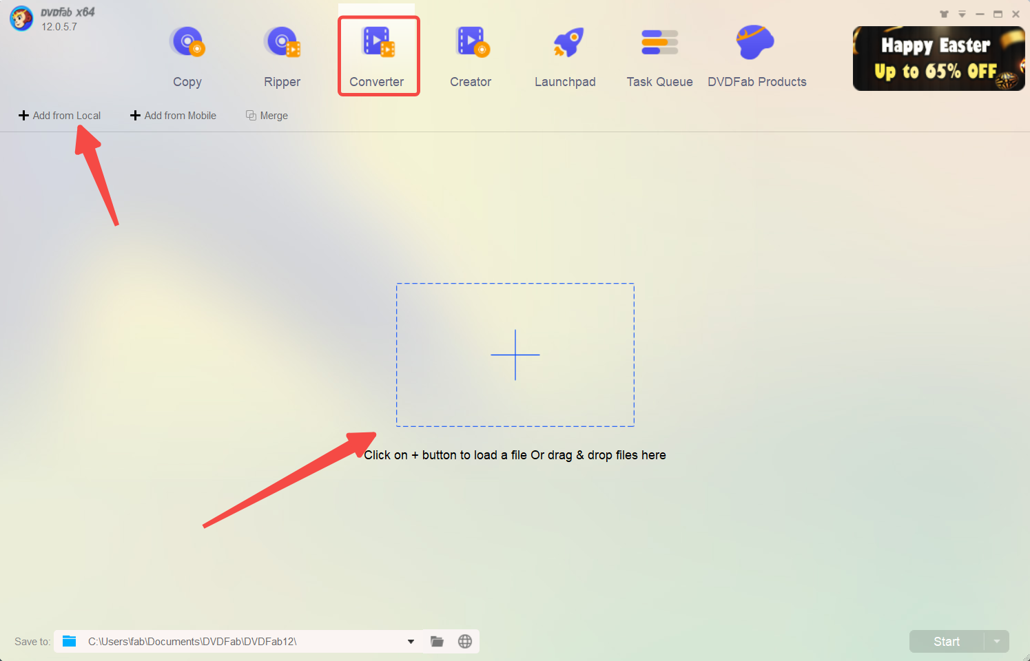 3. 點擊 "Plus "圖示,找到你要轉檔為MP3的MP4檔案,或者將包含MP4檔案的檔案或資料夾拖放到DVDFab 12視頻轉檔器的主介面。