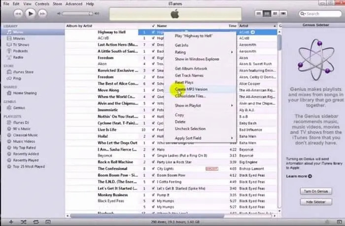 3. 導入一個檔案到你的iTunes資料庫並選擇該檔案。右鍵單擊該檔案,你應該能看到一個 "創建MP3版本 "選項。你也可以通過選擇檔案,進入 "檔案 "菜單,點擊轉檔選項並選擇 "創建MP3版本 "選項來完成。