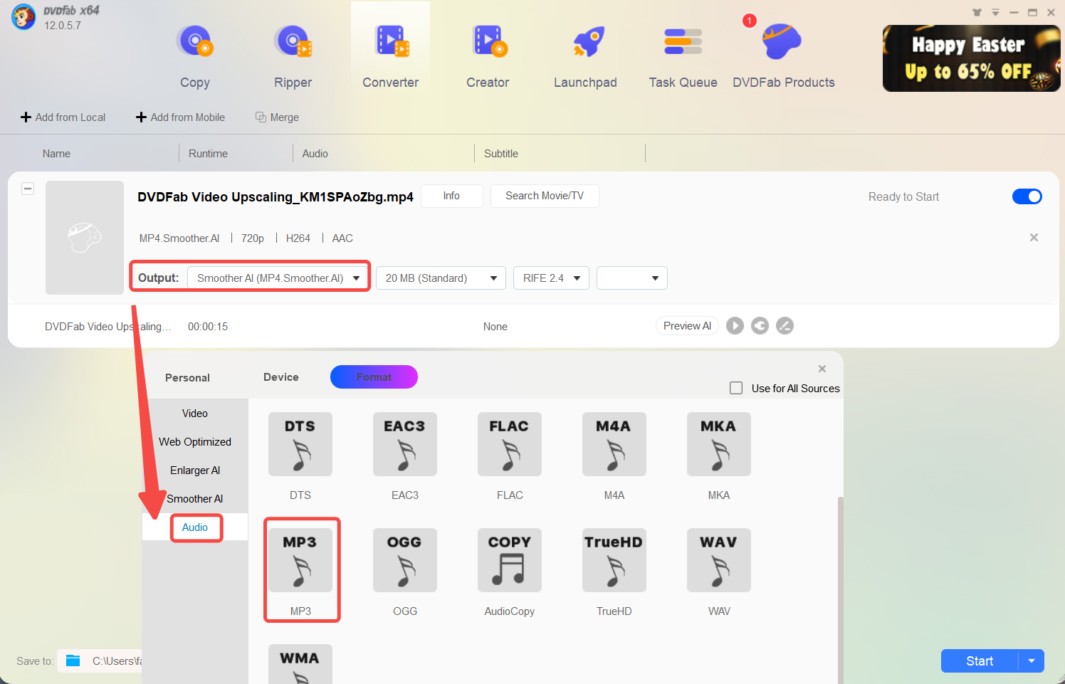 6. 設置完成後,如果你不想把MP3檔案儲存在默認資料夾中,請選擇輸出資料夾。之後,你可以使用 "開始 "按鈕開始轉檔過程,或將其安排到以後。如果檔案太多,你可以使用DVDFab 10 Android應用程式,用手機監控轉檔的進度。