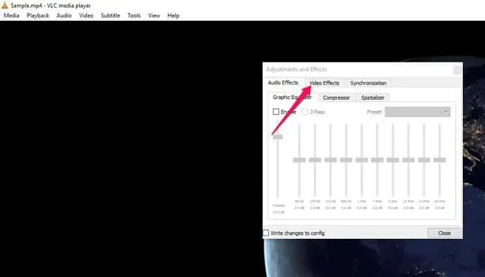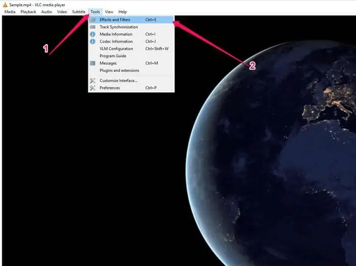 現在,啟動VLC,並打開一個視頻,將視頻拖放到其介面上播放。現在,進入工具>>效果和篩檢程式。