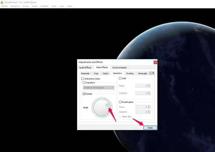 然後點擊角度下的球,並移動它。當視頻被旋轉時停止。點擊關閉。