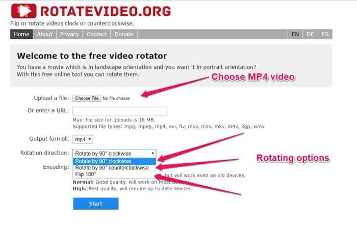 進入網站,選擇一個MP4視頻檔,然後選擇旋轉方向,並點擊 "開始"。在幾分鐘內,視頻將被旋轉。然後你可以下載旋轉的視頻到你的電腦。這就是如何線上旋轉MP4視頻。