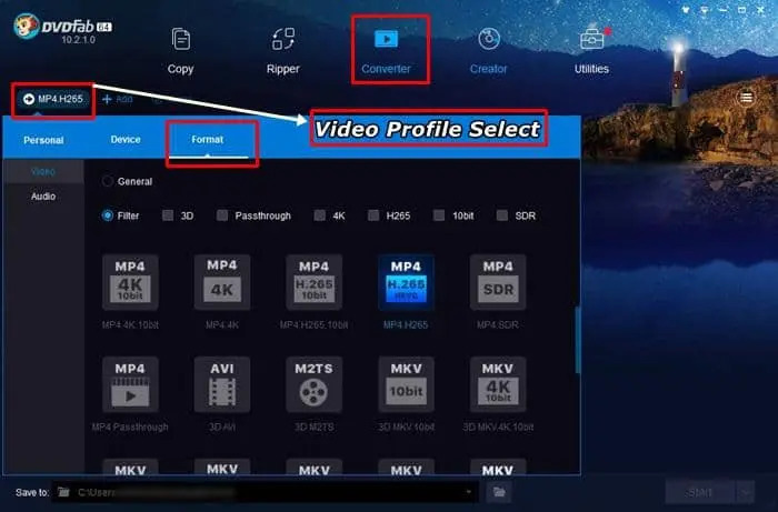 - 打開DVDFab 10 M4V到MP4轉檔器程式,點擊 "轉檔器 "標籤。現在點擊 "選擇視頻配置檔案 "按鈕,然後點擊 "格式 "標籤。從這個列表中選擇'MP4 H265'或其他符合你要求的MP4變體。免費的M4V到MP4視頻轉檔器並沒有提供這麼多的選項。