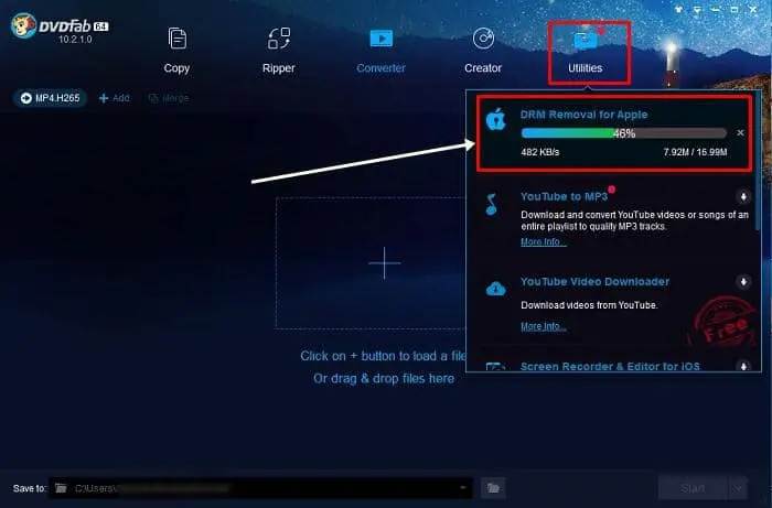 - 打開DVDFab 10,點擊 "實用工具 "標籤,然後點擊 "DRM Removal for Apple"。它將會自動下載並自行安裝。