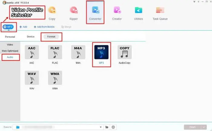 - 現在點擊'視頻配置檔案選擇器'按鈕。然後點擊'格式'標籤,然後點擊左側的'音頻'。從這裏點擊並選擇'MP3'。