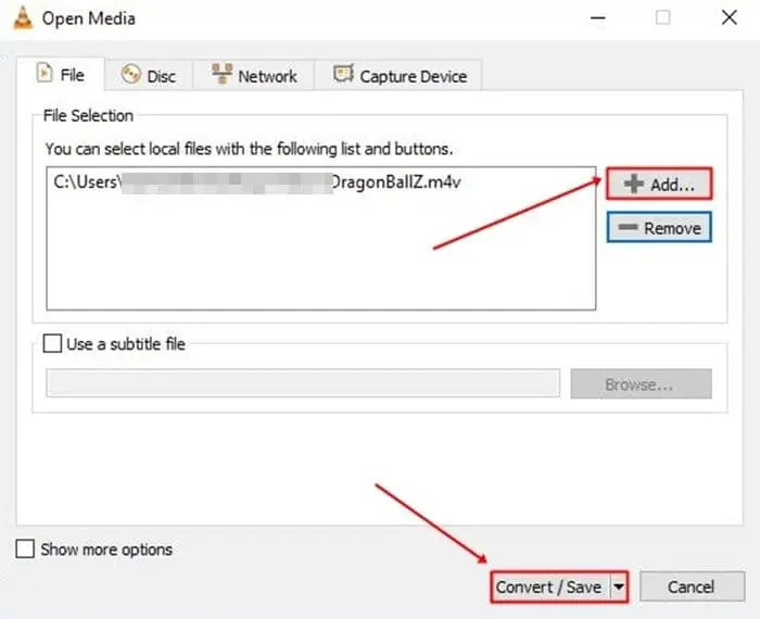 - 一個對話框將打開。在這裏點擊'添加'按鈕並加載你的MKV檔案。然後點擊'轉檔/保存'按鈕。