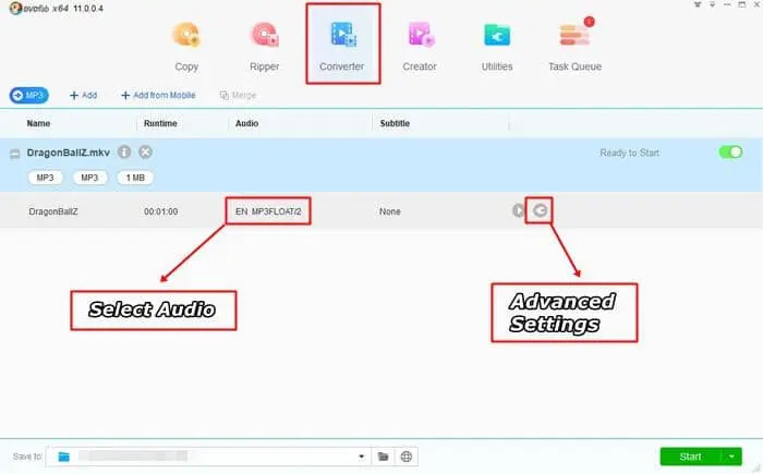- 最後,點擊 "開始 "按鈕,啟動MKV到MP3的轉檔。等待幾分鐘,因為轉檔將取決於檔案大小和你的電腦的處理能力。如果你的電腦配備了高端硬體,不要擔心,因為英特爾快速同步或英偉達CUDA等硬體加速技術將自動發揮作用,提高處理速度。