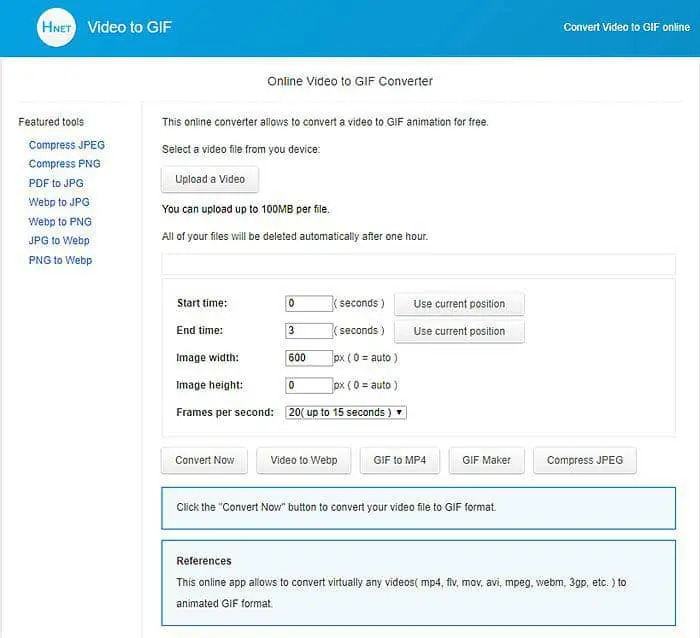 另一個有助於將視頻轉檔為GIF的線上網站是Online Video to GIF Converter。與Video to GIF Converter類似,這個線上網站也需要你首先上傳你的視頻。每次你可以上傳一個不超過100MB的檔。在這裏,有一點值得你注意,那就是你的所有檔將在一小時後被自動刪除。要將視頻轉檔為Gif,你需要設置 "開始時間 "和 "結束時間",或者選擇 "使用當前位置"。此外,你可以決定 "圖像寬度"、"圖像高度 "和 "每秒幀數 "等選項。在 "每秒幀數 "方面,可用的選項包括 "5(最多60秒),7(最多40秒),10(最多30秒),15(最多20秒),20(最多15秒),25(最多12秒)和30(最多10秒)。線上Video to GIF Converter支持MP4、FLV、MOV、AVI、MPEG、WEBM、3GP和其他形式的導入檔。設置所有上述選項後,點擊 "立即轉檔 "按鈕,開始你的視頻轉檔為Gif之旅。