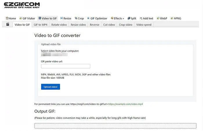Video to GIF Converter是一個線上網站,你可以很容易地從Ezgif.com找到。在這裏,你可以將視頻轉檔為Gif,調整大小,裁剪,反向,優化Gif,並添加一些效果到GIF。為了將視頻轉檔為Gif,你需要從電腦中選擇一個視頻並將其上傳到Video to Gif Converter,或者將視頻的URL輸入到這個線上網站。Video to GIF Converter支持的輸入格式包括MP4、WebM、MPEG、FLV、MOV、3GP和其他。你的檔預計不超過100MB。使用這個線上網站的缺點是,你必須等待很長一段時間。